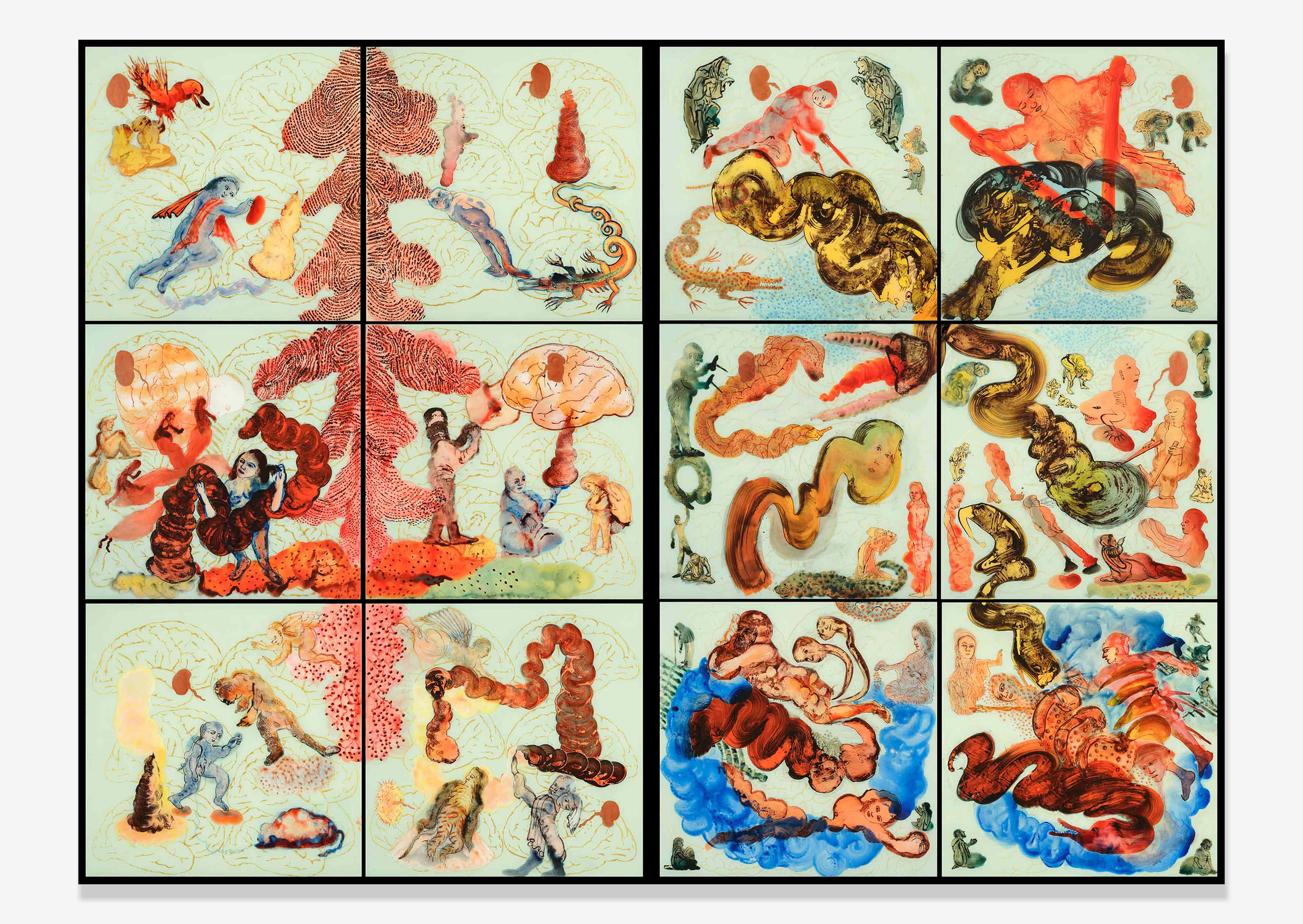 In 2007, chosen by Robert Storr for the 52nd Venice Biennale, Malani created a series of “reverse paintings” using a traditional technique of painting the underside of glass. In the same year, the IMMA in Dublin dedicated to her a retrospective, showing her paintings, drawings, videos and projections. In 2017, the Kiran Nadar Museum of Art in New Delhi and the Stedelijk Museum in Amsterdam exhibited her work. Two major retrospectives of Malani’s oeuvre were held in 2018 at the Centre Pompidou in Paris and at the Castello di Rivoli in Turin.