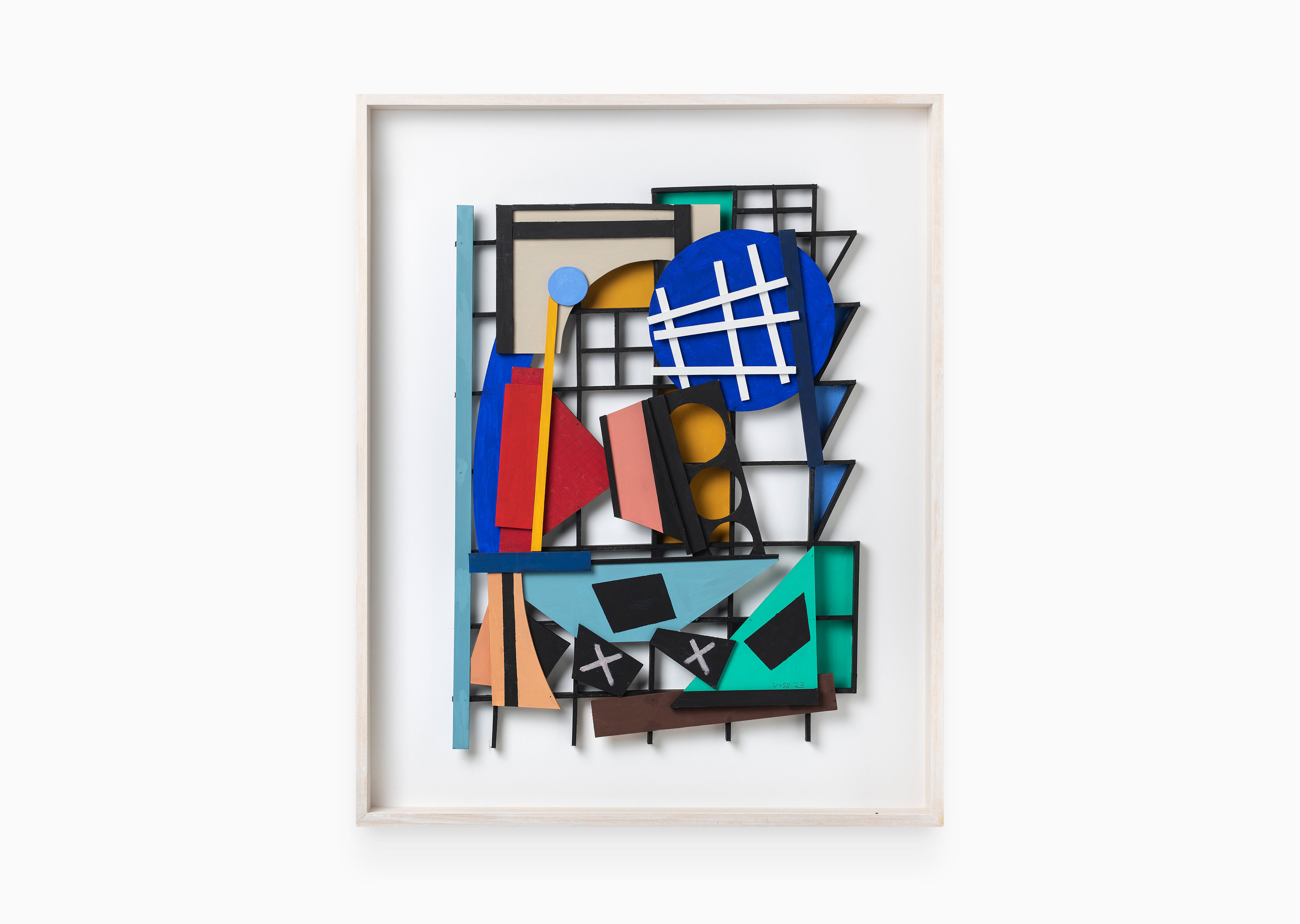 "Monsieur Carton Plume ("Feather Board") is a character who is entirely devoid of feathers, yet without having been plucked. He has a soft foam heart and a white skin that protects his heart. Lightweight, he presents himself well, despite his stiffness. And everyone knows Monsieur Papier, so he needs no introduction. I chose these two actors to appear on stage at 38, avenue Matignon because of their strong personalities, their distinction and their presence. They don't speak or write to us (although Monsieur Papier learnt this a long time ago), but through their poses, their way of being, of appearing, and, of course, through the colours of their appearance. A silent show, but not necessarily a mute one. The colours are bold, robust and contained within limits that Monsieur Plume has carefully controlled; he balances them on relatively stable grid-based scaffolding. We suspect that he’s got a thing for architecture. Monsieur Papier, on the other hand, prefers the same intense accoutrement of colours, sometimes exclusive, but with multiple tonal interferences. In his case, the contours are less clear-cut, the boundaries between different territories less controlled, with intrusions allowed. We suspect that he’s got a libertarian streak. Architects, libertarians, immigrants from who knows where, welcome all of you. Your residence permit on these walls is valid."
